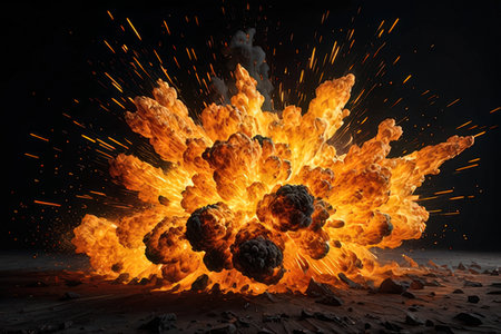 AI Generated. A dramatic explosion with fiery flames and thick, billowing smoke, surrounded by flying debris and dust The image captures the intense energy and chaos of a powerful blast