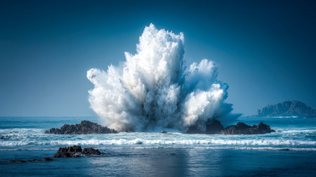 Towering surf erupts against rugged cliffs, sending a colossal spray into the air beneath a vivid azure sky in a striking coastal panorama.