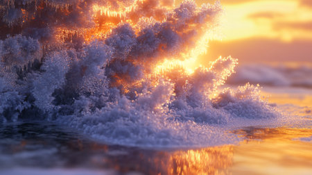 A vibrant wave crashes near the shore, catching the golden rays of the setting sun