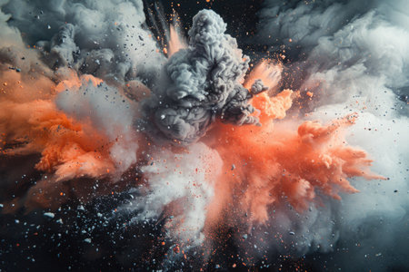 Capturing the dynamic freeze motion of orange powder and particles exploding against a striking black background, creating an intense visual impact