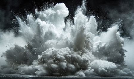 A massive explosion creating a voluminous cloud against a stark black background, capturing the chaotic and intense essence of the moment.