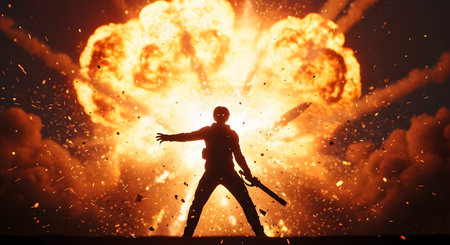 A silhouette of an action hero holding a rifle stands defiantly in front of a massive, fiery explosion. Debris and sparks fly through the air, creating a dramatic and intense cinematic scene. The image conveys themes of survival, power, conflict, and heroism.