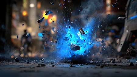 A striking blue explosion erupts amidst flying debris in a gritty urban environment, showcasing energetic motion and dramatic effects, ideal for impactful visuals.