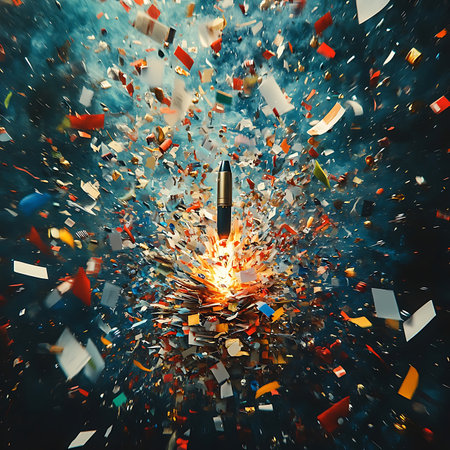 A vivid representation of a rocket launch, featuring a burst of colorful shards and bright light amidst a dynamic, energetic background, showcasing the thrill of motion and technology.
