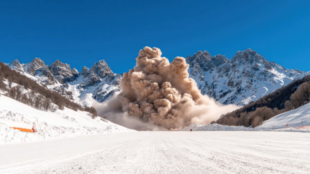 A powerful avalanche erupts in a snowy mountain range, creating a massive cloud of snow and debris under a clear blue sky.
