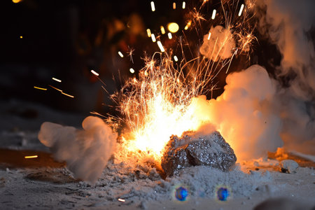 A dramatic image showcasing bright orange sparks erupting from a metal object on a dark surface, capturing the intense energy and dynamic motion of the fire and explosive reaction.