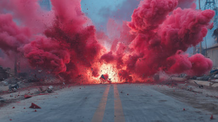 A vibrant explosion of red smoke creates a striking visual effect on an urban street. Dust and debris rise dramatically, enhancing the chaotic atmosphere.