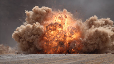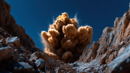 Explosive cloud of dust and debris fills air, creating dramatic and chaotic scene. powerful eruption showcases shades of brown and beige, evoking sense of intensity and energy