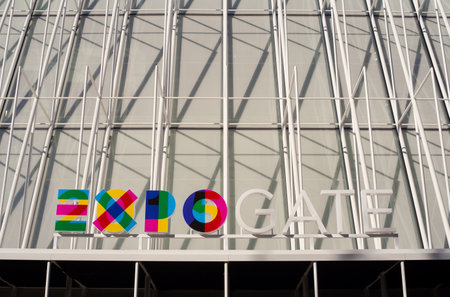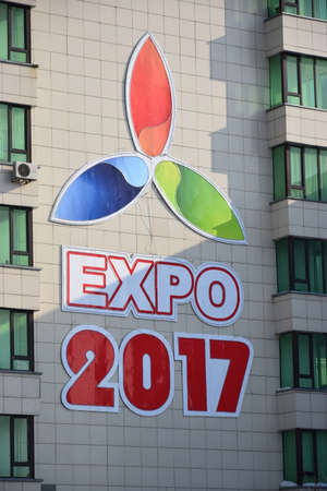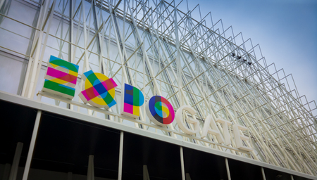 MILAN, ITALY - JUNE 20, 2015: Expo Milan 2015 logo in the building on June 20, 2015. Expo 2015 is the current Universal Exposition being hosted by Milan, Italy.