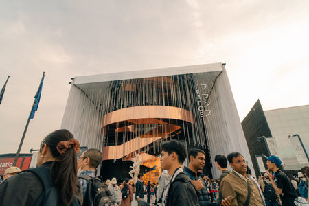 Dubai, United Arab Emirates - October 13, 2021: Sunset at Expo Dubai. People taking photos in front of Thailand Pavilion at the Expo 2020 Dubai UAE