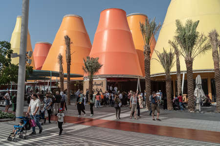 UAE, Dubai - November 28, 2021: Exhibition EXPO 2020. People walk along between pavilions. Exhibition Hall Russian pavilion