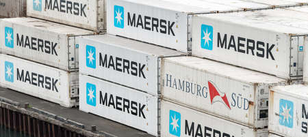 Large group of sea cargo freight containers Maersk and Hamburg Süd stacked on pier in container terminal warehouse commercial sea port in Pacific Ocean. Kamchatka Peninsula, Russia - August 27, 2019.
