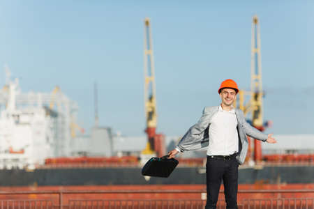 Handsome young unshaven successful business man in gray suit and protective construction orange helmet holding case, spreading hands, walking in sea port against cargo ship and crane background