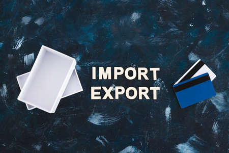 international trade and global business concept, Import Export text next to open parcel box with credit cards