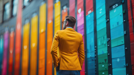Man in Vibrant Yellow Jacket Admiring Colorful Modern Art Installation on Urban Street