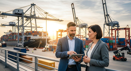 Businessman and businesswoman using digital tablet while standing at container terminal during sunset