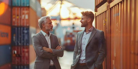 Portrait of two confident businessmen talking in front of container cargo terminal