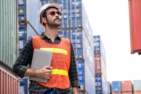 Engineer worker or technical standing in the container yard shipping area and holding a laptop and inspect the quality of container. Feeling stress and excitement. Industrial and export concept