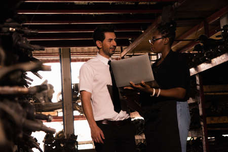 Woman using tablet and talk with man. Diversity of two people, black African worker woman using tablet with caucasian business manager in factory-warehouse