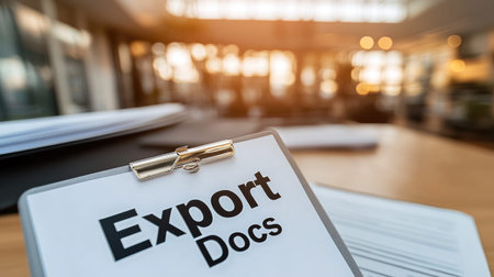 Close-up of export documents on a clipboard in a bright, modern office setting. The image emphasizes organization and professionalism in business operations.