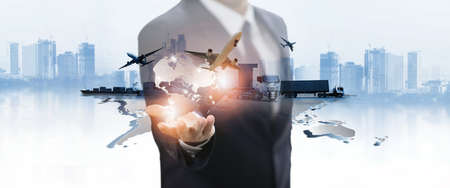 Double exposure of businessman work industry and safety concept container truck ,ship in port and freight cargo plane in transport and import-export commercial logistic ,shipping business industry
