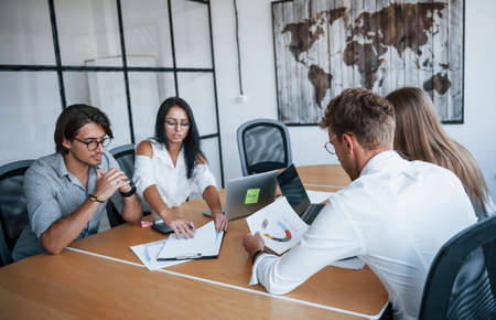Mixed races coworkers analysing different business papers and working with computers at the tables in modern office.