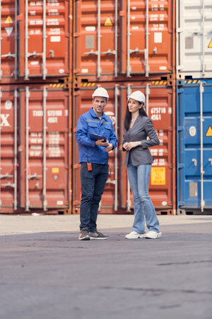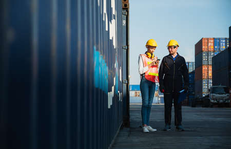 Two foreman man & woman worker working checking at Container cargo harbor to loading containers. Dock male and female staff business Logistics import export shipping concept.