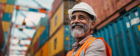 Indian worker standing in front of stacked shipping containers. Container terminal - freight shipping background. Import export concept. International trade banner