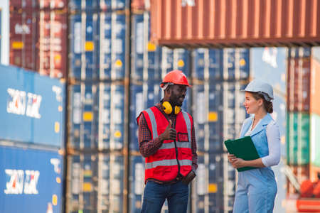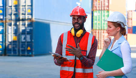A female engineer and a young African-American man monitor and supervises the loading of containers at a commercial shipping port. Happy to use the concept of teamwork. import-export import-export