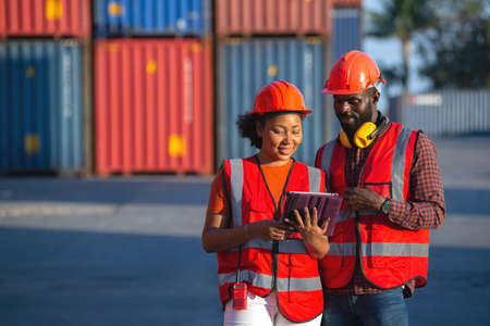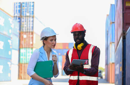 A young African-American engineer and Caucasian woman manager monitors and supervises the loading of containers at a commercial shipping port. happy using tablet concept import export import export