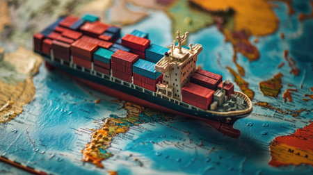 Miniature container ship on a world map, illustrating the concepts of globalization and international trade, with space for copy or branding.
