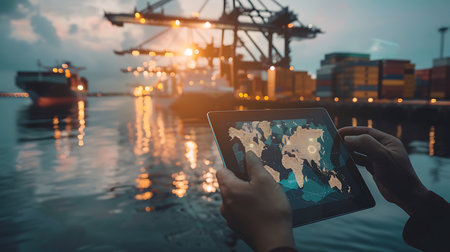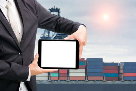 Engineering working hold tablet in front of cargo loading workplace