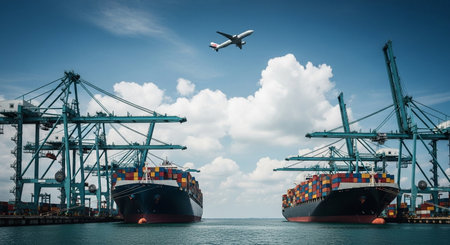 Massive container ships are docked at a bustling commercial port, featuring large cranes and a distant airplane, signifying global trade.