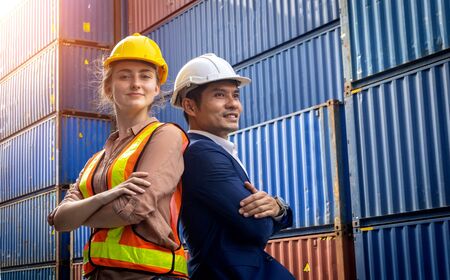Female engineer checking containers box with worker man from cargo