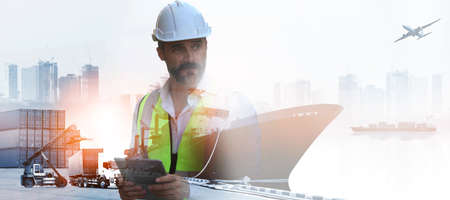 Foreman control Industrial Container Cargo freight ship at industry. Transportation and logistic.