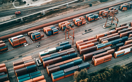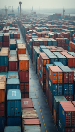 An expansive view of a shipping container yard filled with colorful containers, creating a vibrant yet industrial landscape. The image captures the organized chaos of logistics, showcasing the intricate patterns formed by stacked containers against a backdrop of a cloudy sky.