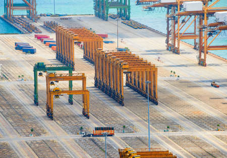 Industrial equipment, freight cranes and steel constructions on pier at empty cargo shipping port of Singapore, aerial view