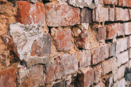 photographed close-up of an old crumbling brick wall of the building, disfocus