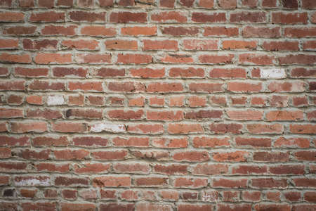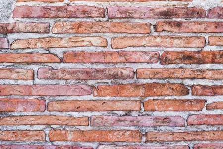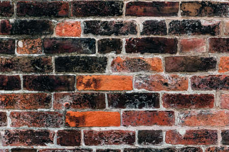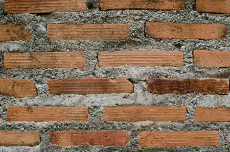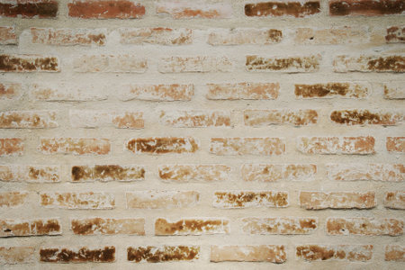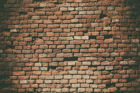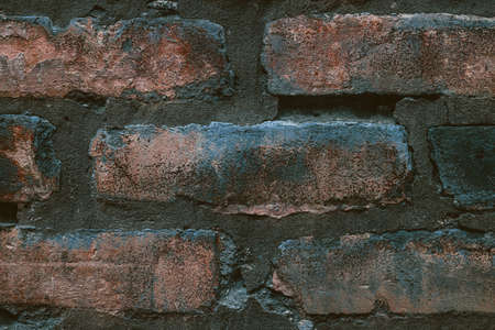 Old and worn red brick wall face with white and black cement coating peeling away.