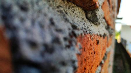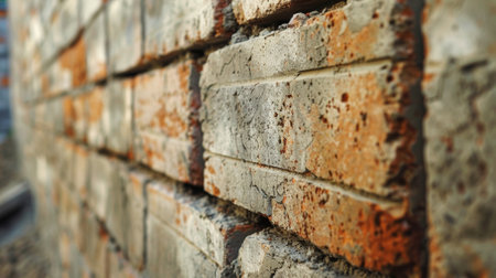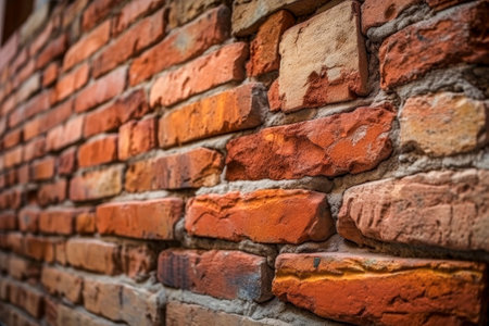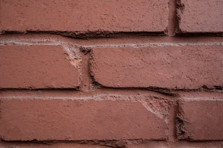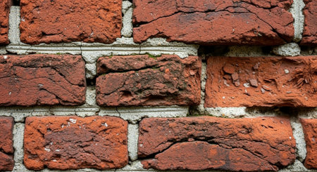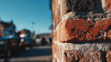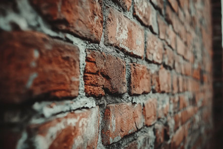 Detailed close-up of a weathered red brick wall with visible mortar, showing rustic textures and urban architectural charm.