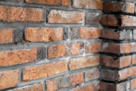 Side angle of a red brick wall corner. Close up view of cracked weathered brickwork material. Modern interior design, unique perspective. Loft like room style at home. Rusty facade architecture.