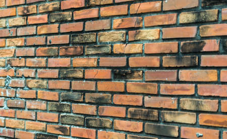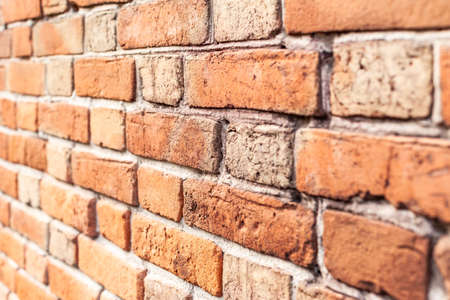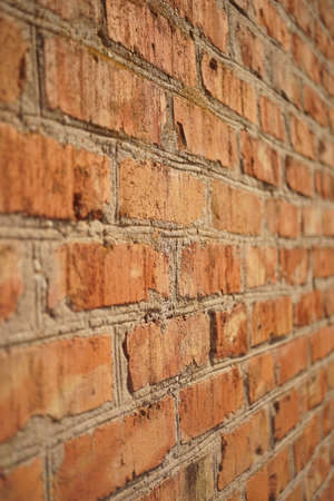 Fragment of brown brick wall with a shallow depth of field, at an angle to the plane. Selective focus.