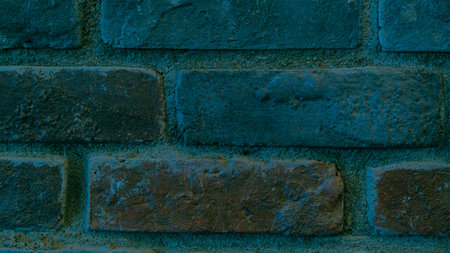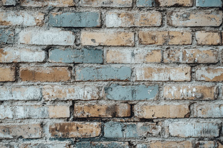 A close-up of a weathered brick wall with faded blue paint and mortar.
