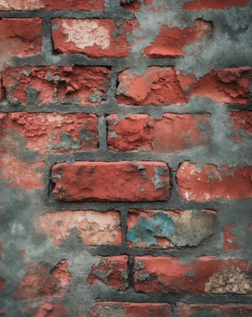 A close-up view of a textured red brick wall featuring faded paint and rustic charm, perfect for backgrounds and artistic projects. Explore the character and depth.