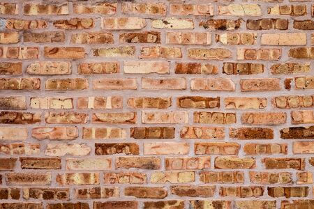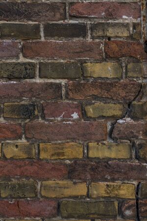 Detailed view at a colorful old and weathered brick wall texture. Panoramic background.