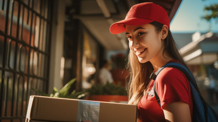 A smiling female delivery worker in a red uniform holds a parcel, ready to deliver it. Green foliage and urban apartments in the background create a friendly atmosphere.