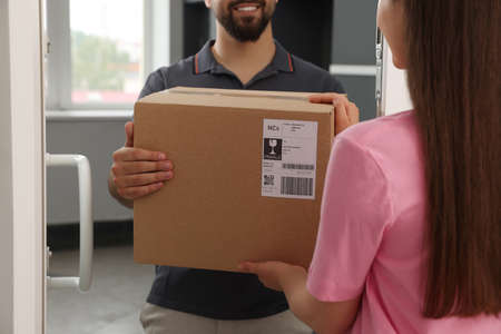 Woman parcel receiving from courier at home, closeup