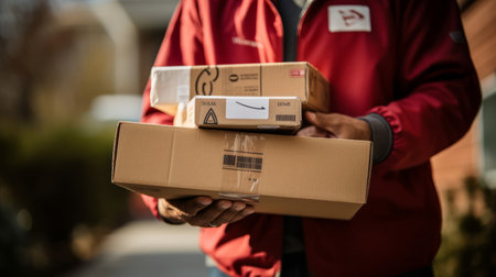 Faceless delivery man giving Amazon prime cardbox parcel box to customer blurred street background. Generative ai