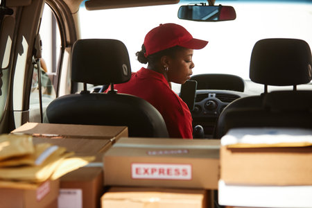 Caucasian woman in her 20s working as a driver of a delivery truck. Female courier looking at her smartphone and reading information to deliver the next package
