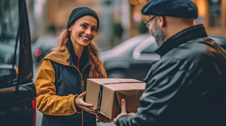 cheerful courier hands over well branded package delighted customer outside their home, showcasing trust and satisfaction in delivery services